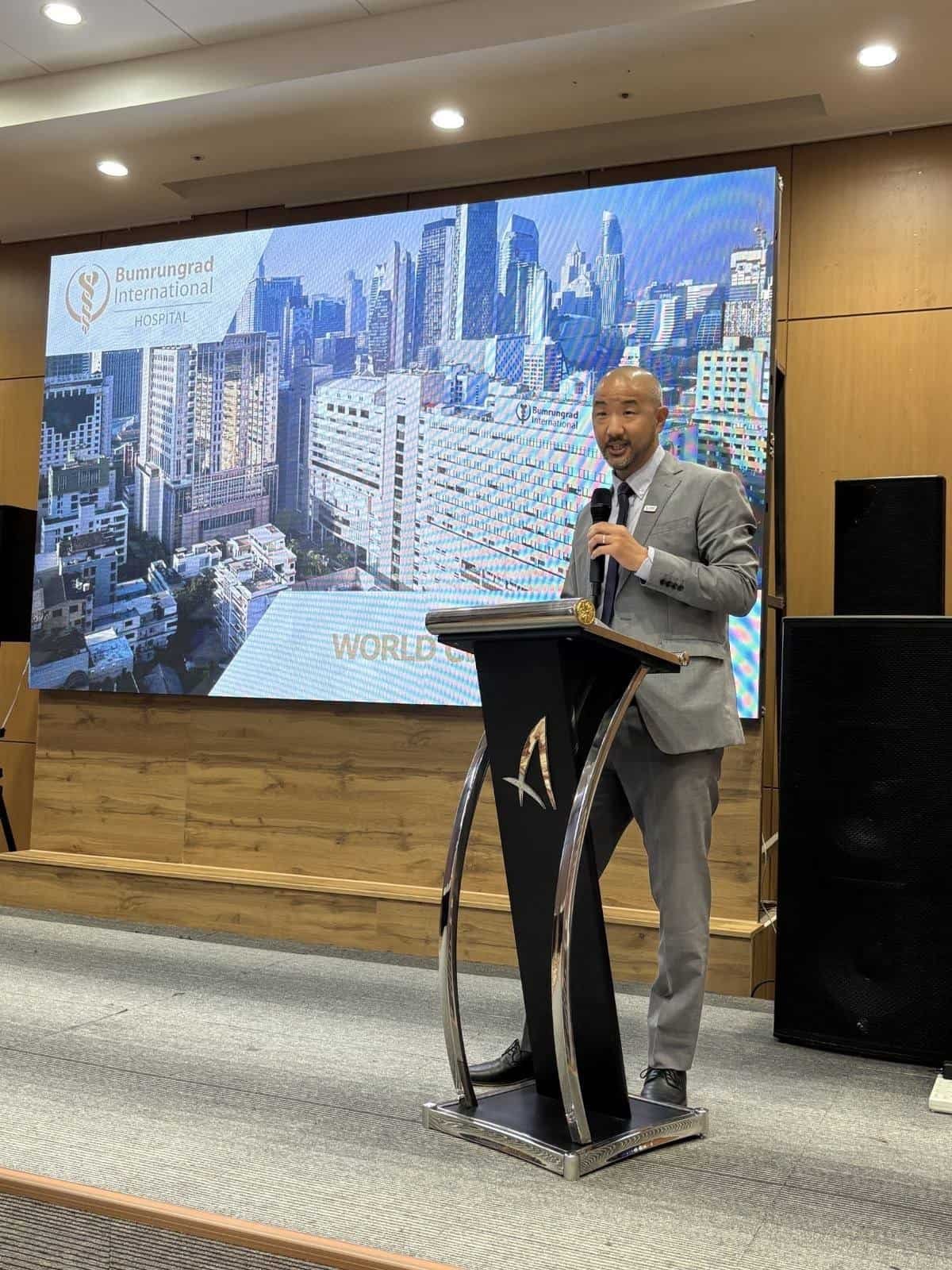 Mr. Udo Kim, Senior Manager of International Business Development at Bumrungrad International Hospital—one of Bangkok’s most prominent and comprehensive private medical institutions—presented the hospital’s internationally recognized services. He highlighted advanced treatments led by highly experienced specialists, enhanced by cutting-edge diagnostic and therapeutic technologies.